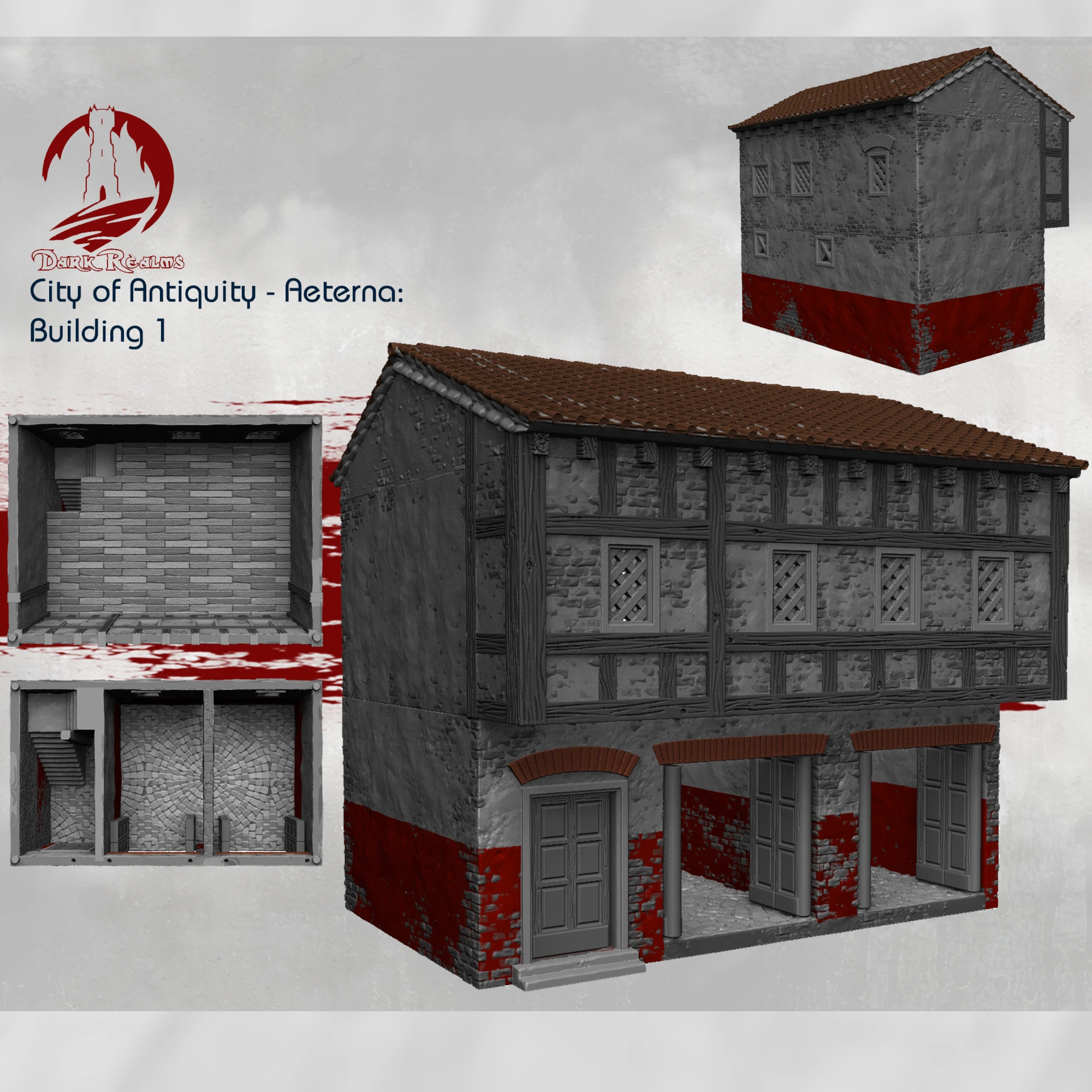 Bâtiment Building 1 de la série City of Antiquity. Décor 3D imprimé en 120 microns, multi-niveaux et jouable. Parfait pour D&D et wargames. Livré non peint.