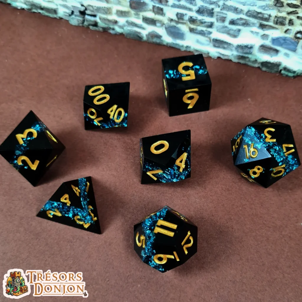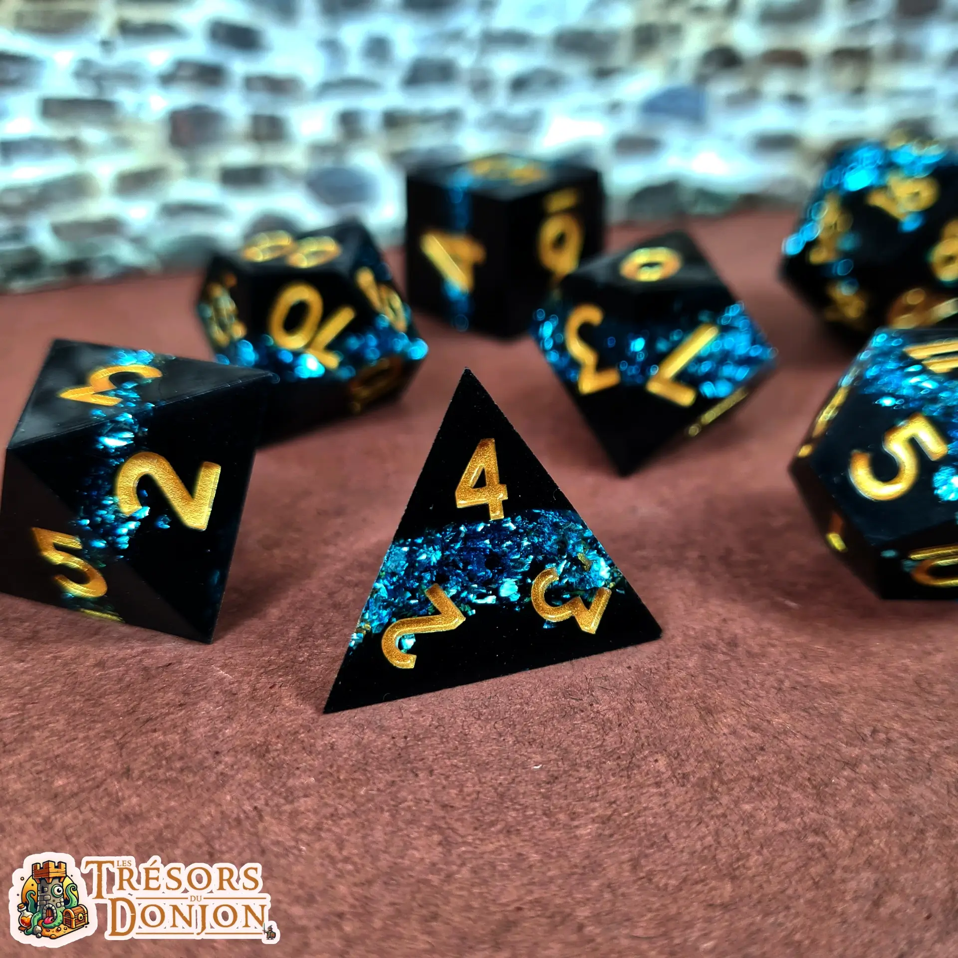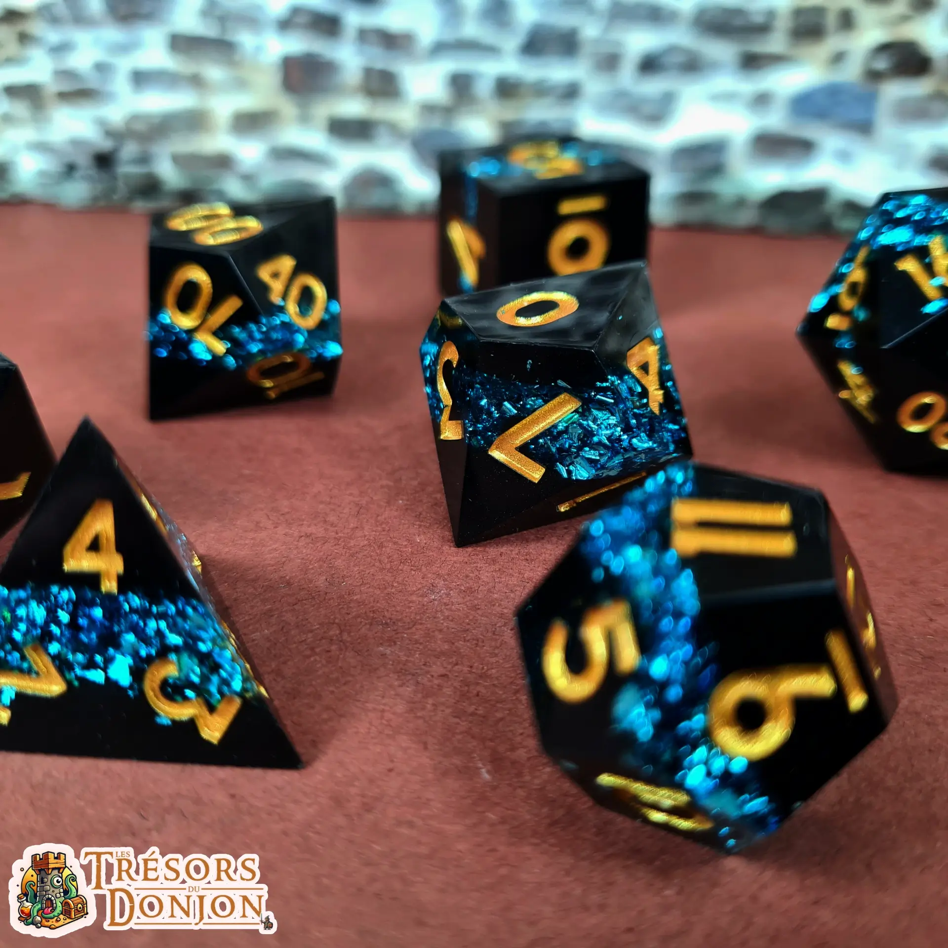 Cœur sombre, éclats vivants, contraste marqué : ce set combine une base noire profonde — évoquant la nuit du Donjon — avec des inclusions lumineuses qui semblent vibrer dans la résine.