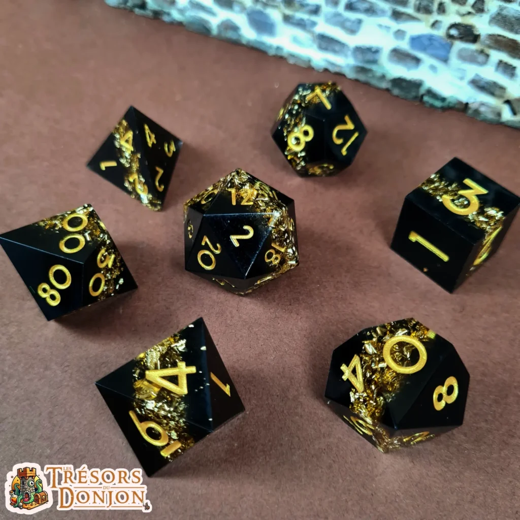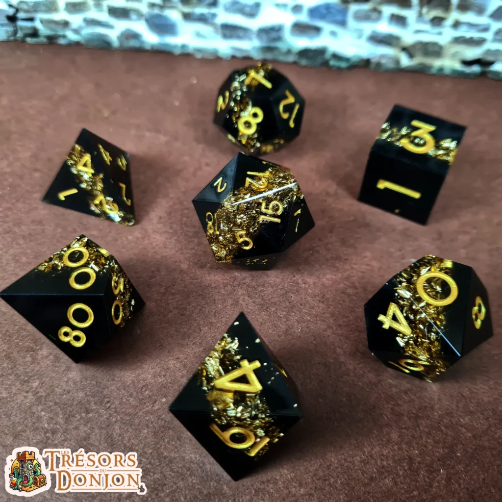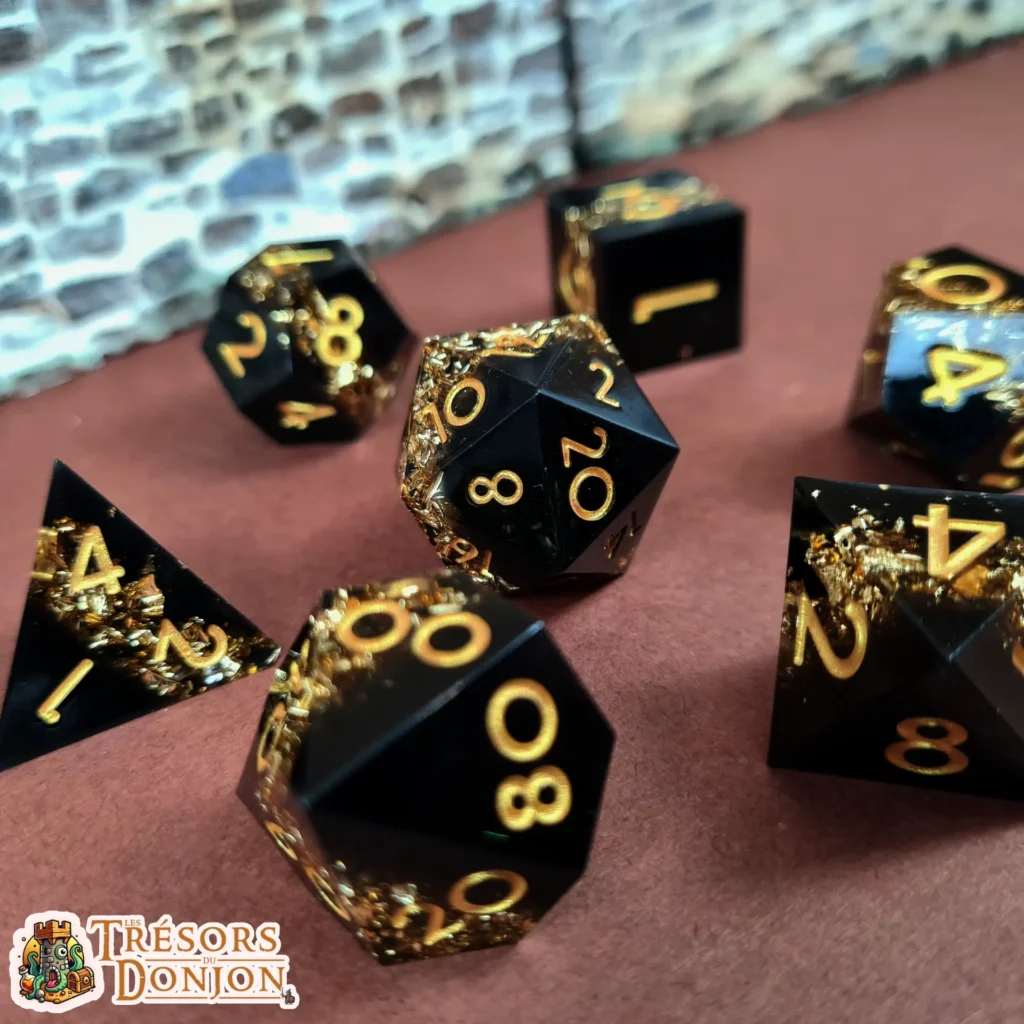 Cœur sombre, éclats vivants, contraste marqué : ce set combine une base noire profonde — évoquant la nuit du Donjon — avec des inclusions lumineuses qui semblent vibrer dans la résine.