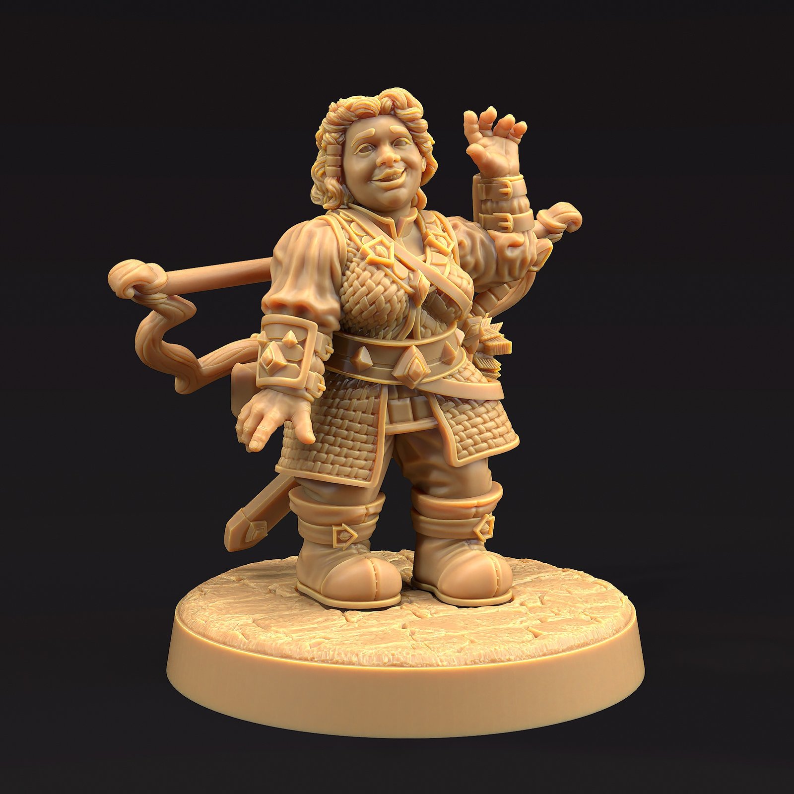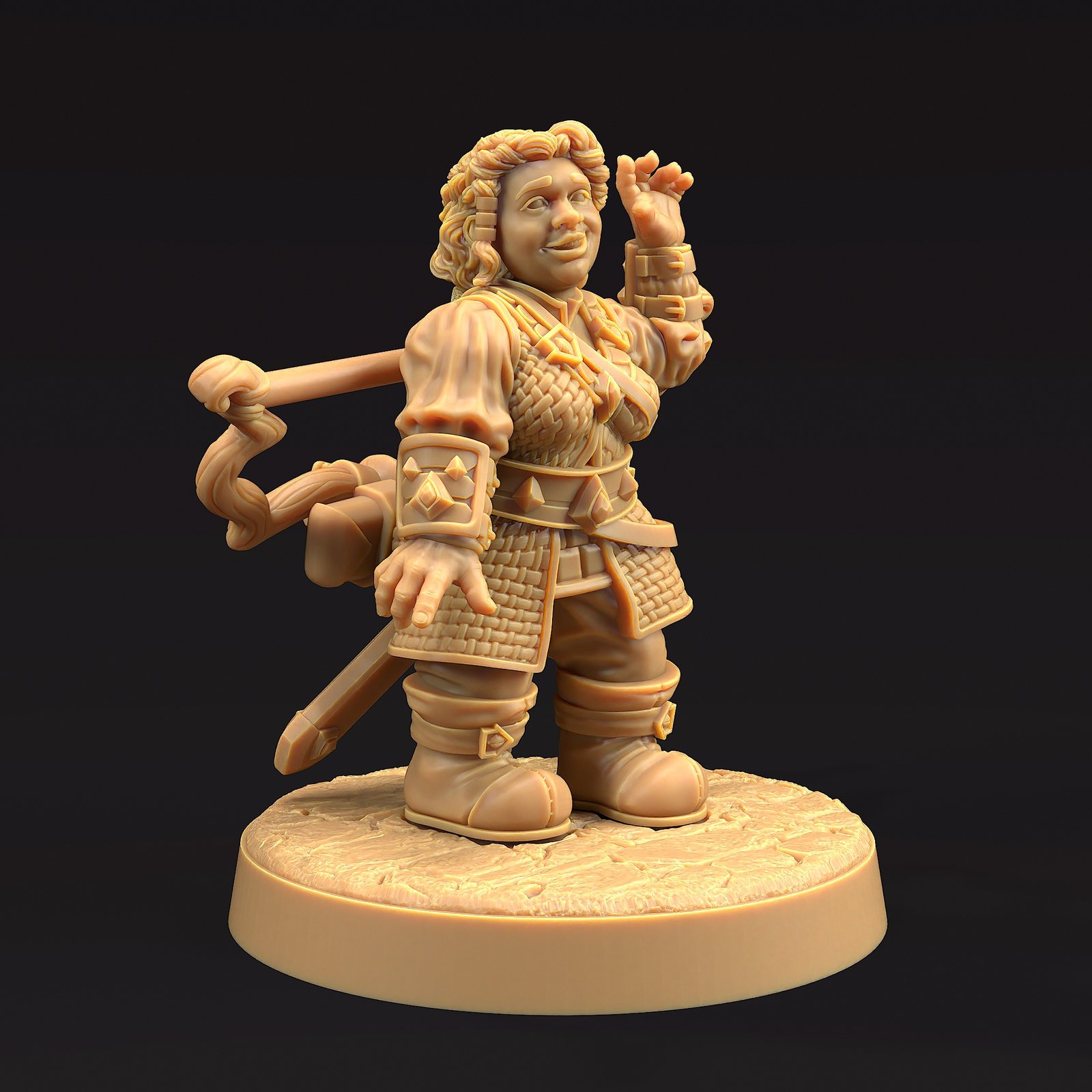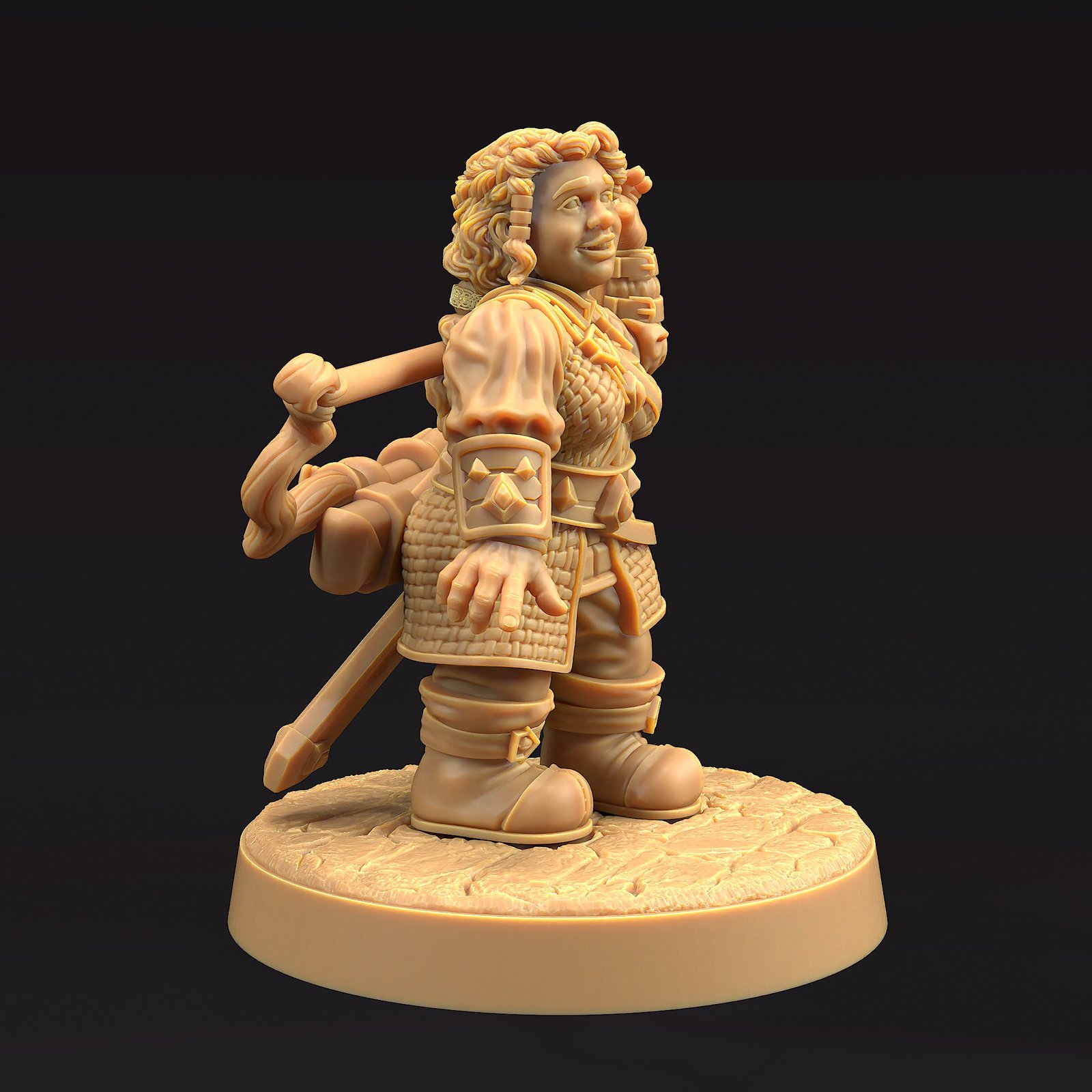 Bouclier en avant, posture solide, expression presque moqueuse : cette figurine fonctionne immédiatement comme point focal visuel sur une table de jeu.