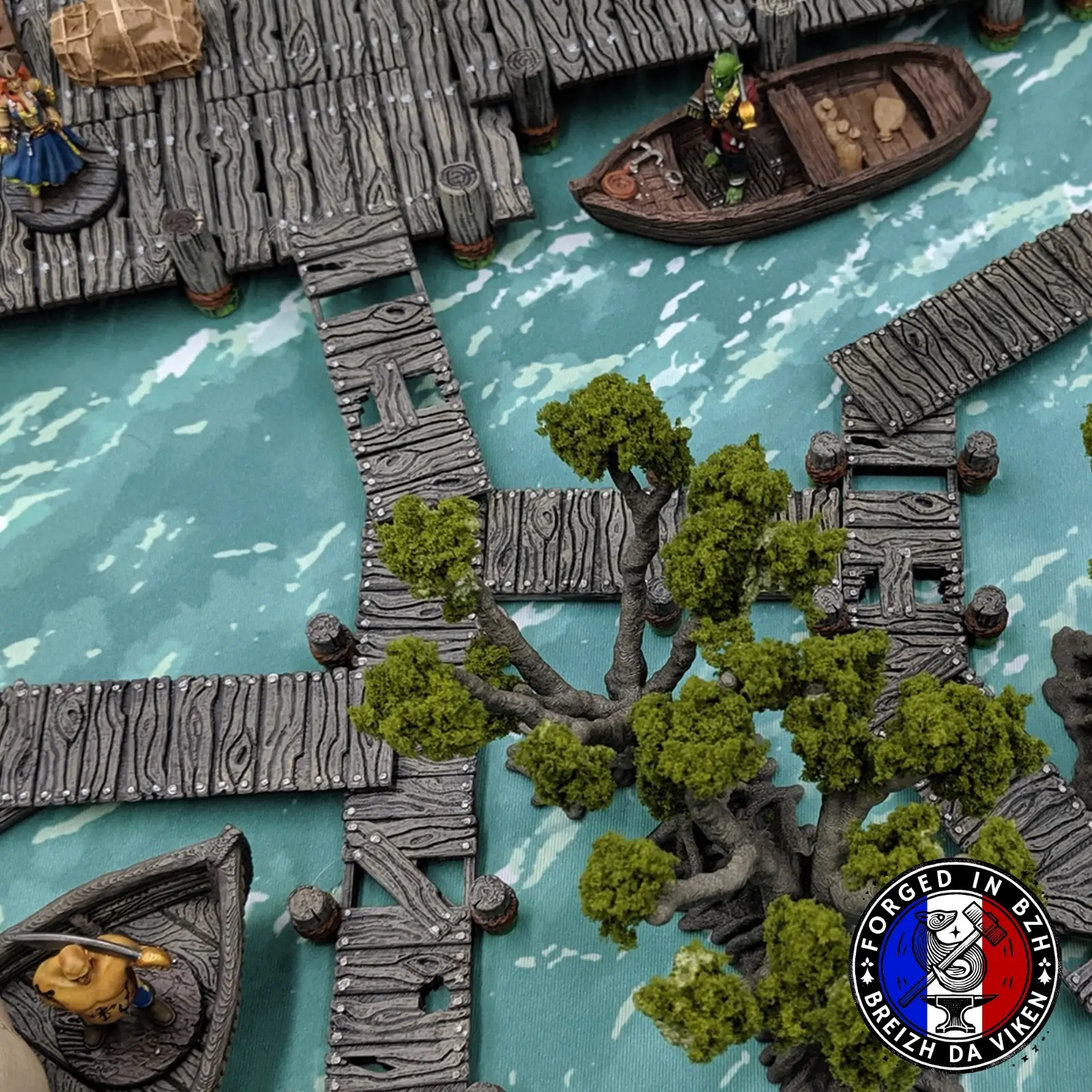 Les arbres et figurines visibles sur la première photo ne font pas partie du set — ils illustrent simplement la mise en scène possible : bois rongé par l’eau, passerelles sales de marais, ponton pirate, quai de pêche, structure elfe des marées… C’est votre pinceau qui définira l’ambiance.