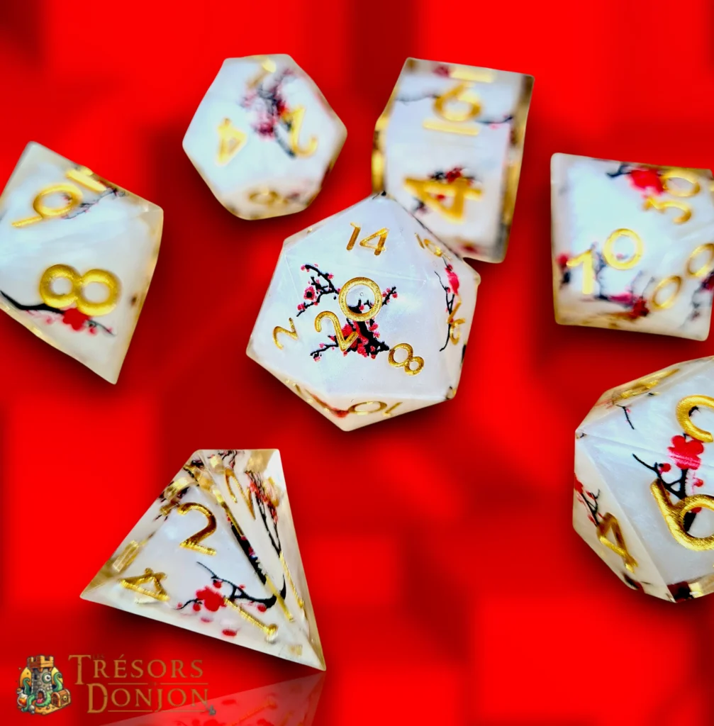 Les dés du set Sakura Eternis arborent une résine blanche nacrée traversée de branches délicates et fleurs rouges rappelant les cerisiers en fleurs du Japon.
