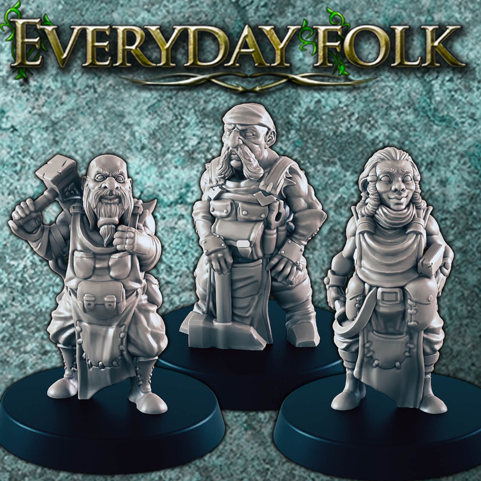 Trio de nains forgerons sculptés avec finesse, imprimés en résine 14K HDR. Parfaits pour peupler vos forges, guildes, villages et ateliers nains. Socles non inclus.