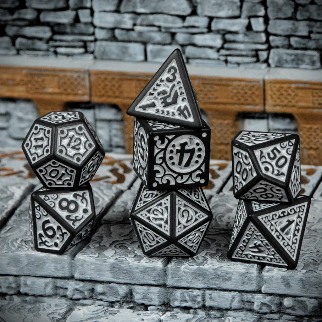 Chaque set de 7 dés polyédriques en acrylique noire texturée évoque un artefact d’un autre âge, prêt à décider du sort de vos quêtes les plus épiques !