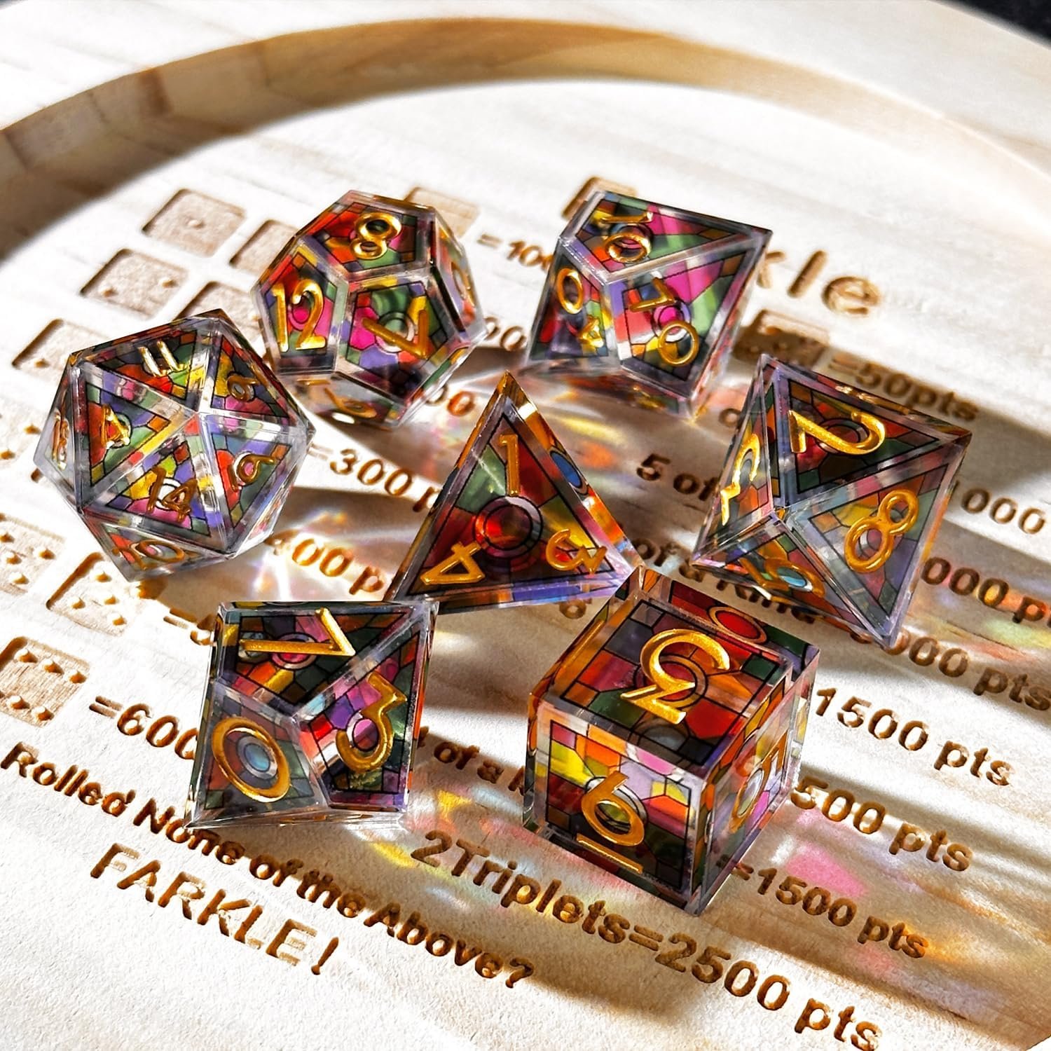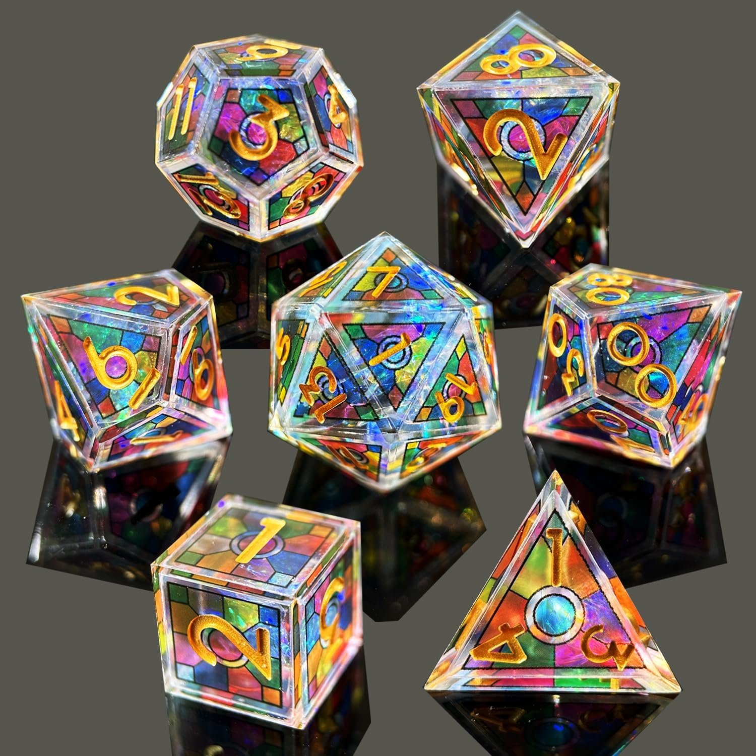 Osez lancer les dés du destin avec ce set de 7 dés polyédriques en résine transparente, incrustés de reflets prismatiques rappelant les vitraux d’un temple ancien.